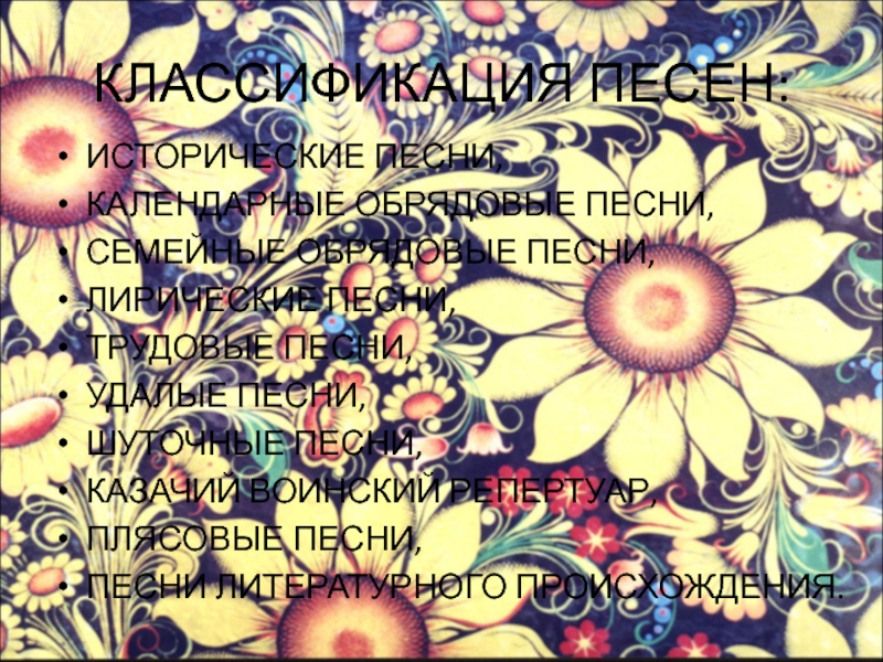 Слайд 5КЛАССИФИКАЦИЯ ПЕСЕН: