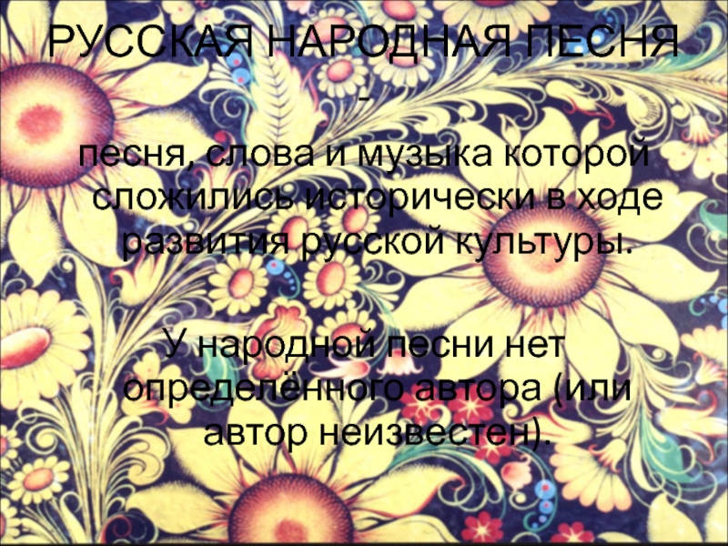 РУССКАЯ НАРОДНАЯ ПЕСНЯ - песня, слова и музыка которой сложились исторически в ходе развития русской культуры. У народной песни нет определённого автора (или автор неизвестен).