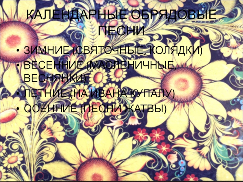 КАЛЕНДАРНЫЕ ОБРЯДОВЫЕ ПЕСНИЗИМНИЕ (СВЯТОЧНЫЕ, КОЛЯДКИ)ВЕСЕННИЕ (МАСЛЕНИЧНЫЕ, ВЕСНЯНКИ)ЛЕТНИЕ (НА ИВАНА КУПАЛУ)ОСЕННИЕ (ПЕСНИ ЖАТВЫ)