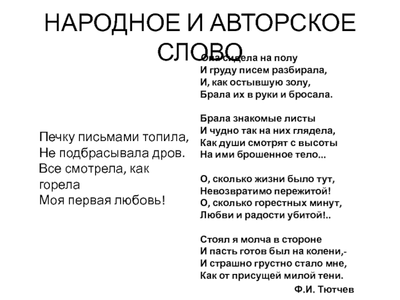 НАРОДНОЕ И АВТОРСКОЕ СЛОВО      Печку письмами топила, Не подбрасывала дров. Все смотрела,