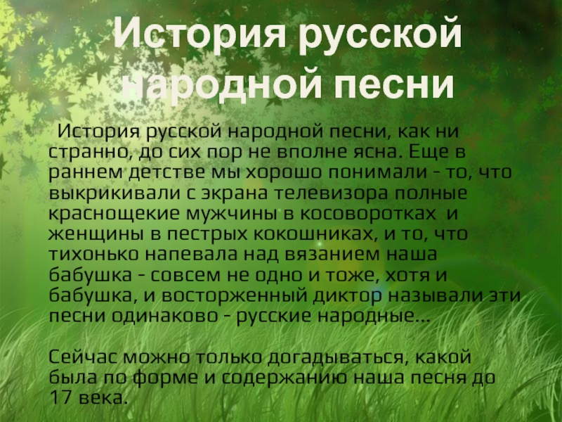 Сейчас можно только догадываться, какой была по форме и содержанию наша песня до 17 века.