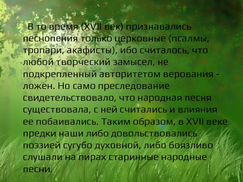 замысел, не подкрепленный авторитетом верования - ложен. Но само преследование свидетельствовало, что народная песня существовала, с ней считались и влияния ее побаивались. Таким образом, в XVII веке предки наши либо довольствовались поэзией сугубо духовной, либо боязливо слушали на пирах старинные народные песни.
