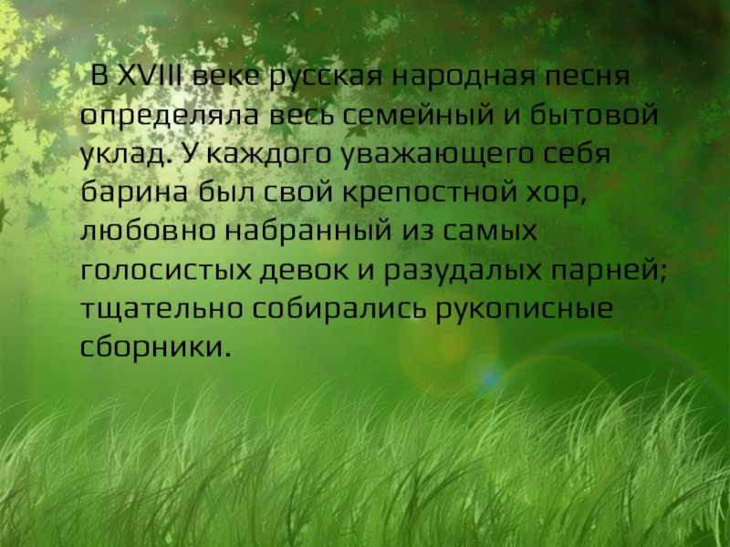 был свой крепостной хор, любовно набранный из самых голосистых девок и разудалых парней; тщательно собирались рукописные сборники.