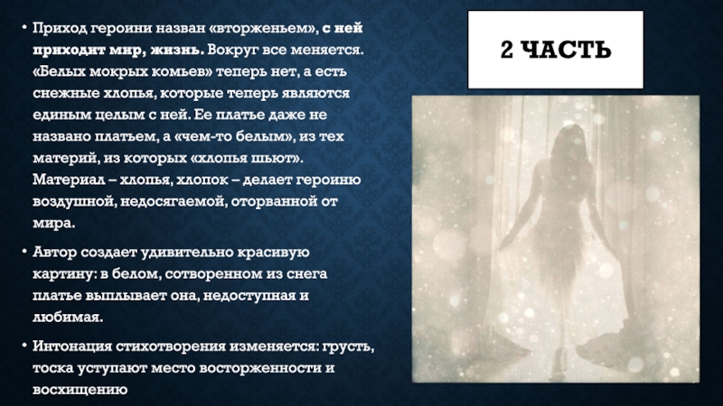 Автор создает удивительно красивую картину: в белом, сотворенном из снега платье выплывает она, недоступная и любимая.
