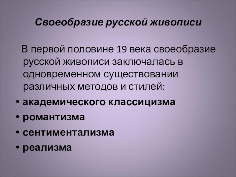 русской живописи заключалась в одновременном существовании различных методов и стилей: