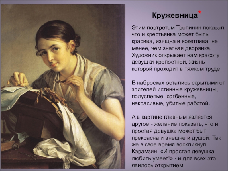 Слайд 66Этим портретом Тропинин показал, что и крестьянка может быть красива,