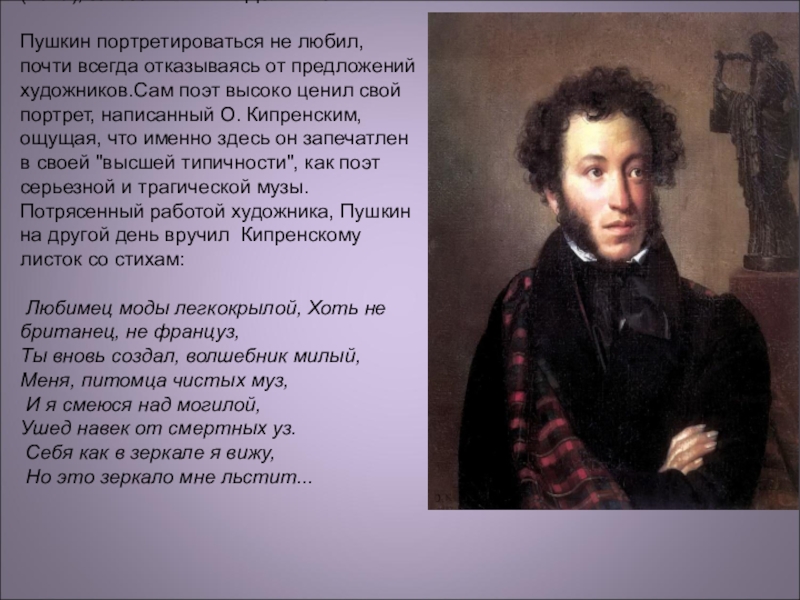 портрет, написанный О. Кипренским, ощущая, что именно здесь он запечатлен в своей "высшей типичности", как поэт серьезной и трагической музы. Потрясенный работой художника, Пушкин на другой день вручил Кипренскому листок со стихам: