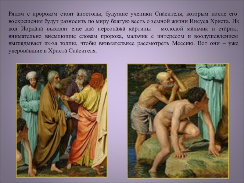 жизни Иисуса Христа. Из вод Иордана выходят еще два персонажа картины – молодой мальчик и старик, внимательно внемлющие словам пророка, мальчик с интересом и воодушевлением выглядывает из-за толпы, чтобы внимательнее рассмотреть Мессию. Вот они – уже уверовавшие в Христа Спасителя.