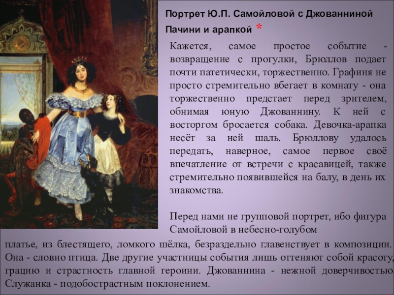 торжественно. Графиня не просто стремительно вбегает в комнату - она торжественно предстает перед зрителем, обнимая юную Джованнину. К ней с восторгом бросается собака. Девочка-арапка несёт за ней шаль. Брюллову удалось передать, наверное, самое первое своё впечатление от встречи с красавицей, также стремительно появившейся на балу, в день их знакомства.