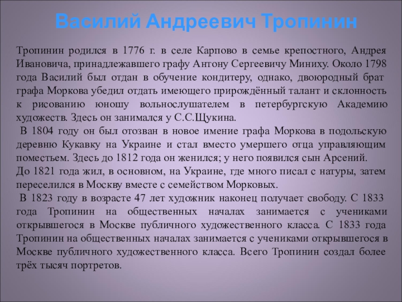 В 1823 году в возрасте 47 лет художник наконец получает свободу. С 1833 года Тропинин на общественных началах занимается с учениками открывшегося в Москве публичного художественного класса. С 1833 года Тропинин на общественных началах занимается с учениками открывшегося в Москве публичного художественного класса. Всего Тропинин создал более трёх тысяч портретов.