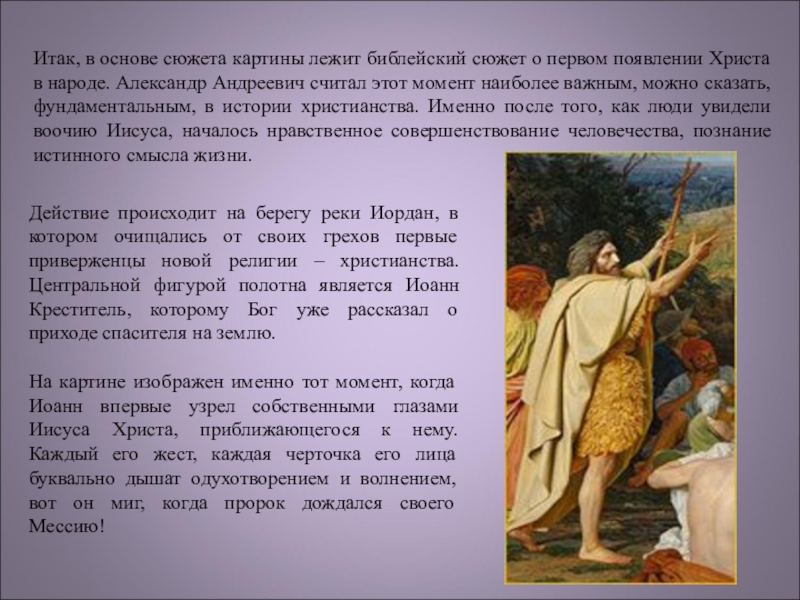 На картине изображен именно тот момент, когда Иоанн впервые узрел собственными глазами Иисуса Христа, приближающегося к нему. Каждый его жест, каждая черточка его лица буквально дышат одухотворением и волнением, вот он миг, когда пророк дождался своего Мессию!
