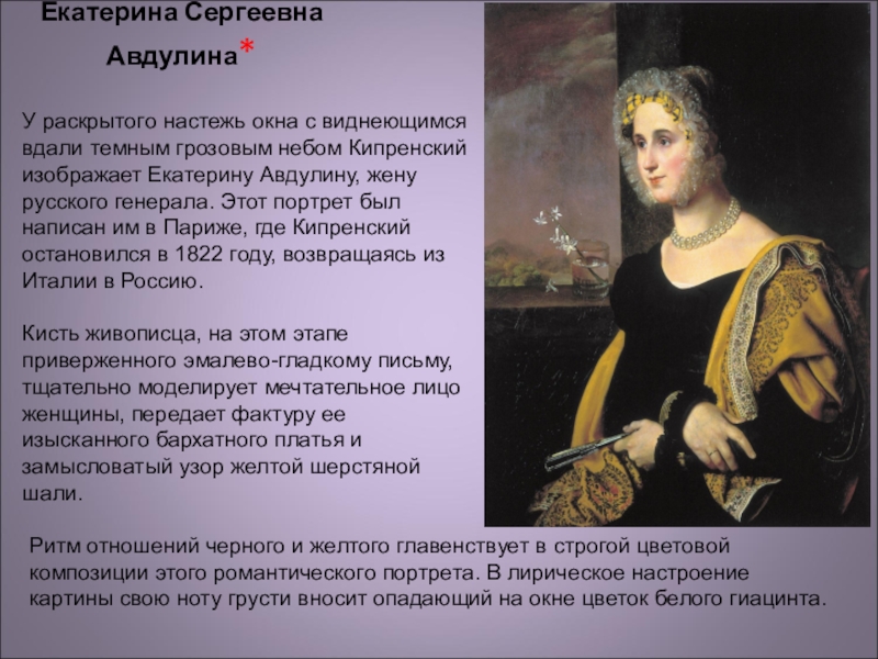 темным грозовым небом Кипренский изображает Екатерину Авдулину, жену русского генерала.