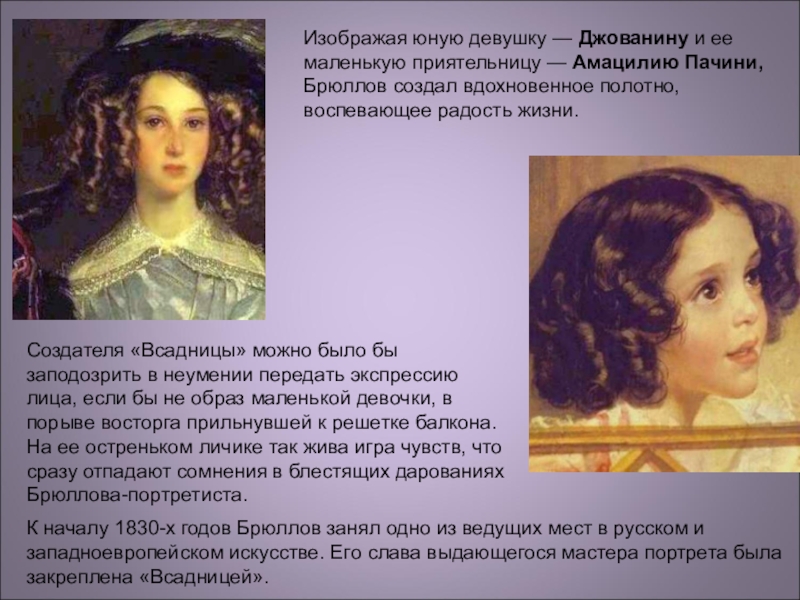 воспитанницу графини Ю.Самойловой — Джованину, художник осмелился изобразить так, как до него изображали только титулованных особ или прославленных полководцев.