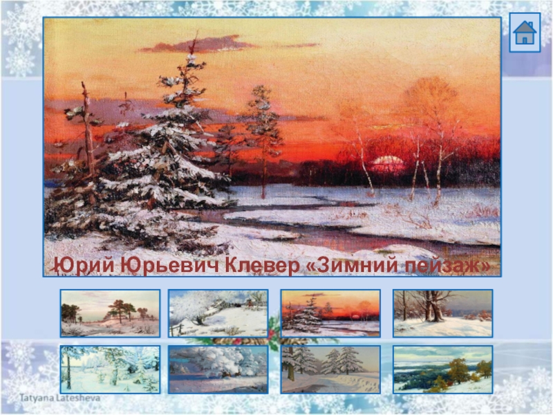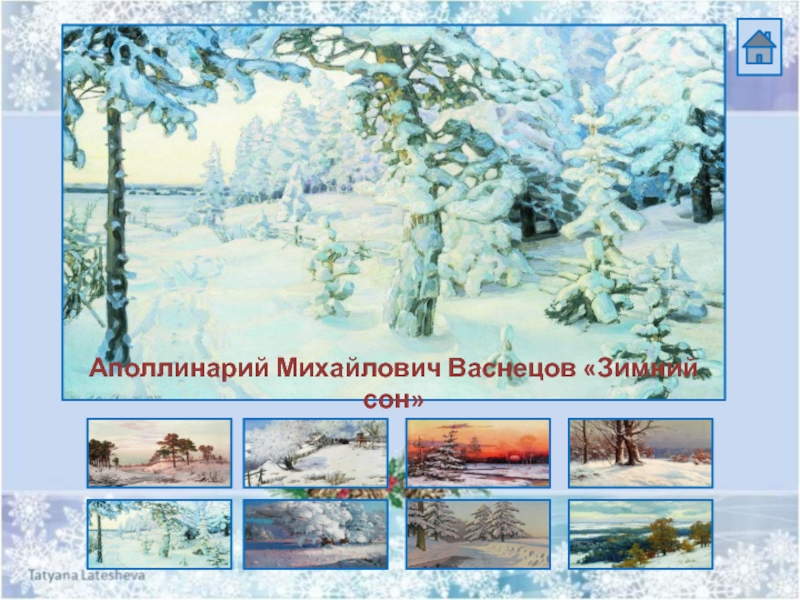 Источники:Василий Ефимович Экгорст «Зимний пейзаж»Аполлинарий Михайлович Васнецов «Зимний сон»Иван Силыч Горюшкин-Сорокопудов «Солнце – на лето, зима –