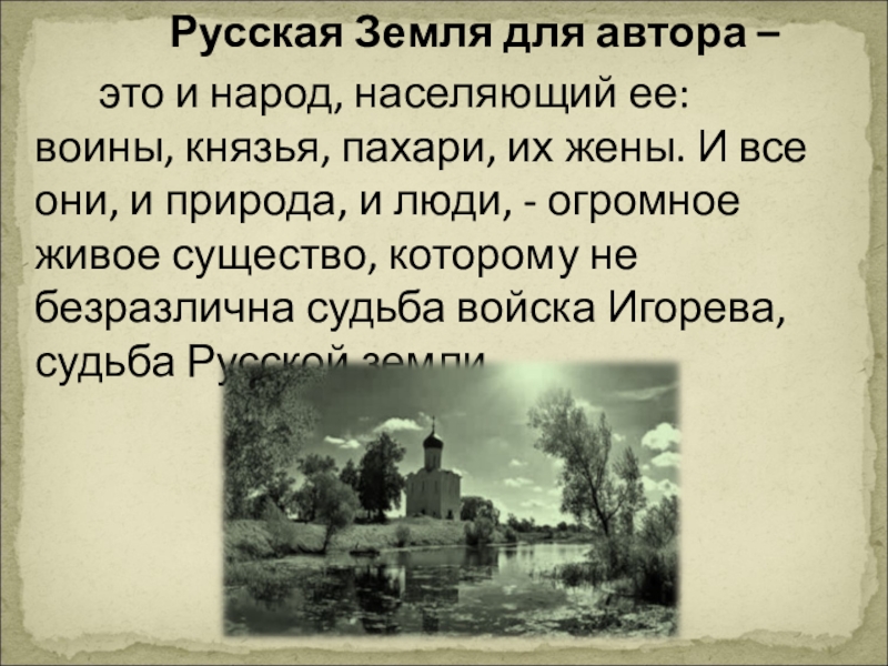 народ, населяющий ее: воины, князья, пахари, их жены. И все они, и природа, и люди, - огромное живое существо, которому не безразлична судьба войска Игорева, судьба Русской земли.