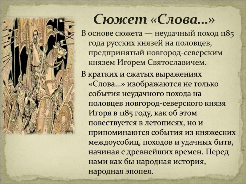 «Слова…» изображаются не только события неудачного похода на половцев новгород-северского князя Игоря в 1185 году, как об этом повествуется в летописях, но и припоминаются события из княжеских междоусобиц, походов и удачных битв, начиная с древнейших времен. Перед нами как бы народная история, народная эпопея.