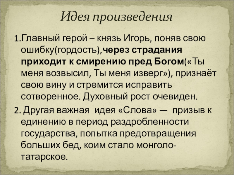 Слайд 171.Главный герой – князь Игорь, поняв свою ошибку(гордость),через страдания приходит