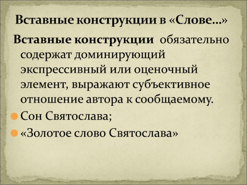 Слайд 9Вставные конструкции обязательно содержат доминирующий экспрессивный или оценочный элемент, выражают