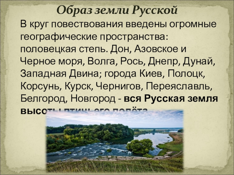 Слайд 18 В круг повествования введены огромные географические пространства: половецкая