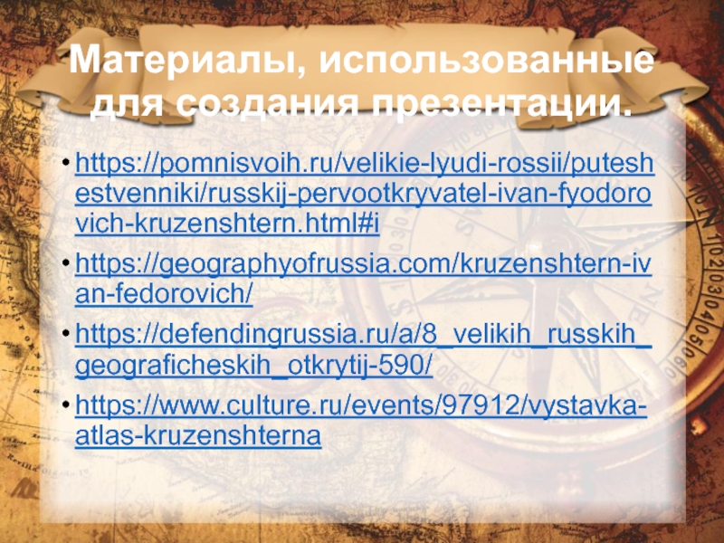 Материалы, использованные для создания презентации.https://pomnisvoih.ru/velikie-lyudi-rossii/puteshestvenniki/russkij-pervootkryvatel-ivan-fyodorovich-kruzenshtern.html#ihttps://geographyofrussia.com/kruzenshtern-ivan-fedorovich/https://defendingrussia.ru/a/8_velikih_russkih_geograficheskih_otkrytij-590/https://www.culture.ru/events/97912/vystavka-atlas-kruzenshterna
