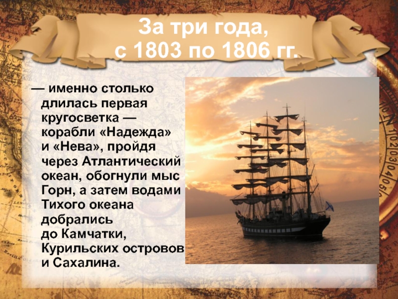 За три года,  с 1803 по 1806 гг.— именно столько длилась первая кругосветка — корабли «Надежда» и «Нева», пройдя через Атлантический океан,