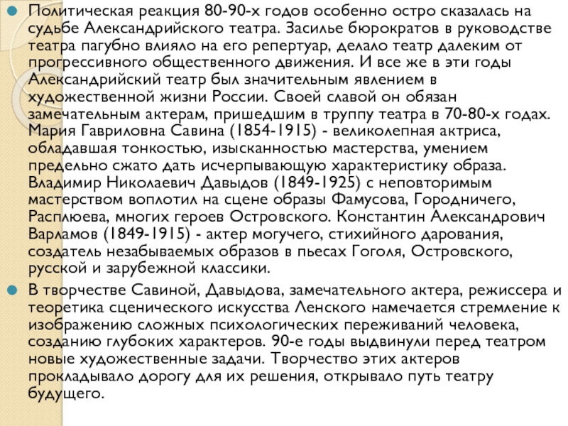 репертуар, делало театр далеким от прогрессивного общественного движения. И все же в эти годы Александрийский театр был значительным явлением в художественной жизни России. Своей славой он обязан замечательным актерам, пришедшим в труппу театра в 70-80-х годах. Мария Гавриловна Савина (1854-1915) - великолепная актриса, обладавшая тонкостью, изысканностью мастерства, умением предельно сжато дать исчерпывающую характеристику образа. Владимир Николаевич Давыдов (1849-1925) с неповторимым мастерством воплотил на сцене образы Фамусова, Городничего, Расплюева, многих героев Островского. Константин Александрович Варламов (1849-1915) - актер могучего, стихийного дарования, создатель незабываемых образов в пьесах Гоголя, Островского, русской и зарубежной классики.