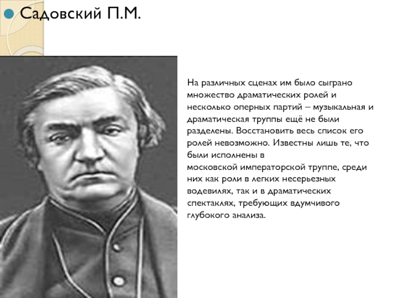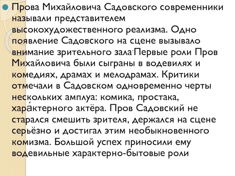 Слайд 12Прова Михайловича Садовского современники называли представителем высокохудожественного реализма. Одно появление Садовского