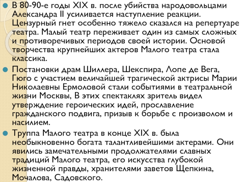 театра. Малый театр переживает один из самых сложных и противоречивых периодов своей истории. Основой творчества крупнейших актеров Малого театра стала классика.