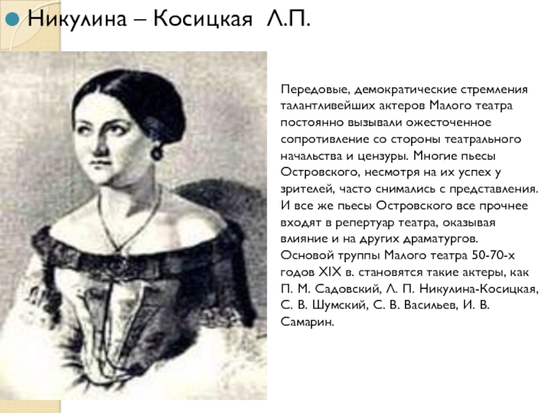 Основой труппы Малого театра 50-70-х годов XIX в. становятся такие актеры, как П. М. Садовский, Л. П. Никулина-Косицкая, С. В. Шумский, С. В. Васильев, И. В. Самарин.