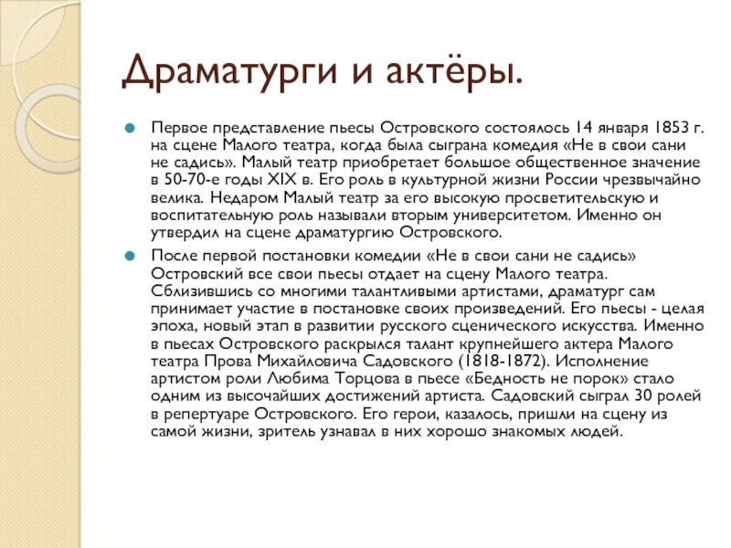 После первой постановки комедии «Не в свои сани не садись» Островский все свои пьесы отдает на сцену Малого театра. Сблизившись со многими талантливыми артистами, драматург сам принимает участие в постановке своих произведений. Его пьесы - целая эпоха, новый этап в развитии русского сценического искусства. Именно в пьесах Островского раскрылся талант крупнейшего актера Малого театра Прова Михайловича Садовского (1818-1872). Исполнение артистом роли Любима Торцова в пьесе «Бедность не порок» стало одним из высочайших достижений артиста. Садовский сыграл 30 ролей в репертуаре Островского. Его герои, казалось, пришли на сцену из самой жизни, зритель узнавал в них хорошо знакомых людей.