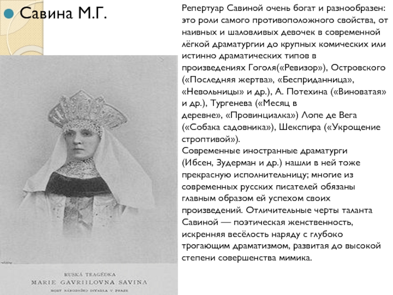 Репертуар Савиной очень богат и разнообразен: это роли самого