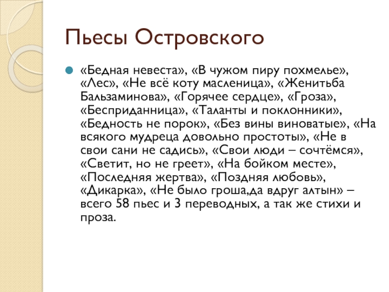 поклонники», «Бедность не порок», «Без вины виноватые», «На всякого мудреца довольно простоты», «Не в свои сани не садись», «Свои люди – сочтёмся», «Светит, но не греет», «На бойком месте», «Последняя жертва», «Поздняя любовь», «Дикарка», «Не было гроша,да вдруг алтын» – всего 58 пьес и 3 переводных, а так же стихи и проза.