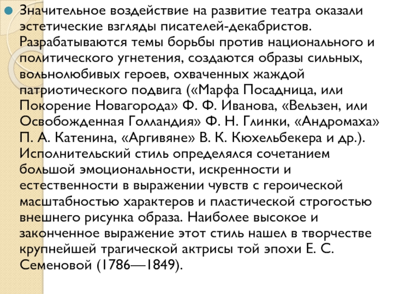 Слайд 2Значительное воздействие на развитие театра оказали эстетические взгляды писателей-декабристов. Разрабатываются
