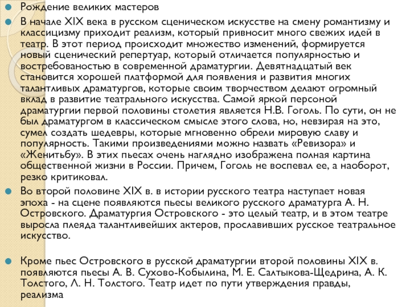 много свежих идей в театр. В этот период происходит множество изменений, формируется новый сценический репертуар, который отличается популярностью и востребованостью в современной драматургии. Девятнадцатый век становится хорошей платформой для появления и развития многих талантливых драматургов, которые своим творчеством делают огромный вклад в развитие театрального искусства. Самой яркой персоной драматургии первой половины столетия является Н.В. Гоголь. По сути, он не был драматургом в классическом смысле этого слова, но, невзирая на это, сумел создать шедевры, которые мгновенно обрели мировую славу и популярность. Такими произведениями можно назвать «Ревизора» и «Женитьбу». В этих пьесах очень наглядно изображена полная картина общественной жизни в России. Причем, Гоголь не воспевал ее, а наоборот, резко критиковал.