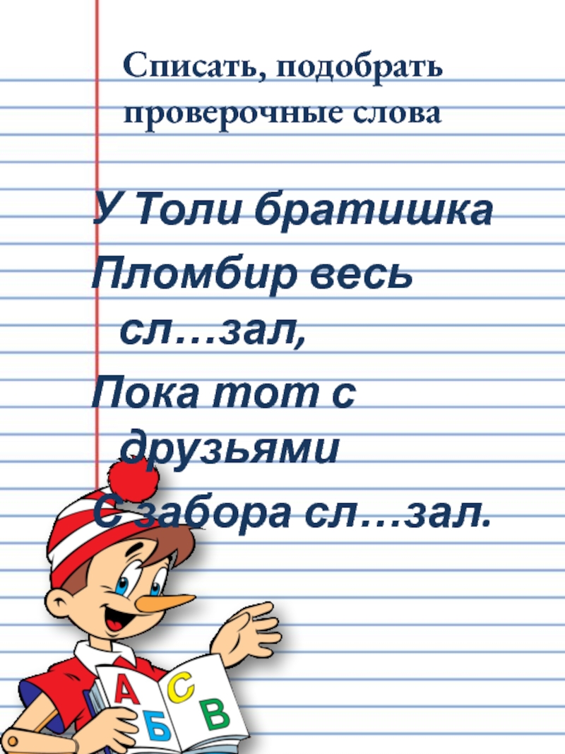 Списать, подобрать проверочные словаУ Толи братишка Пломбир весь сл…зал,Пока тот с друзьями С забора сл…зал.