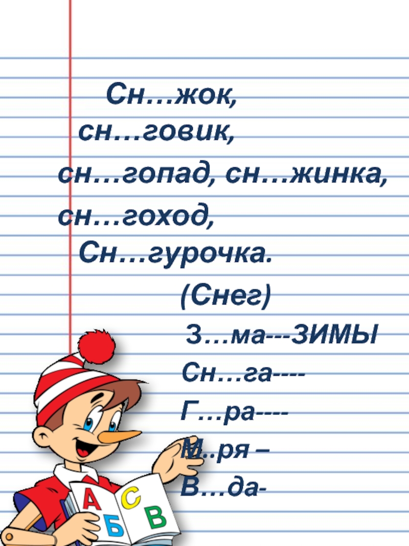 Сн…жок,сн…говик,сн…гопад, сн…жинка,сн…гоход, Сн…гурочка.          (Снег)