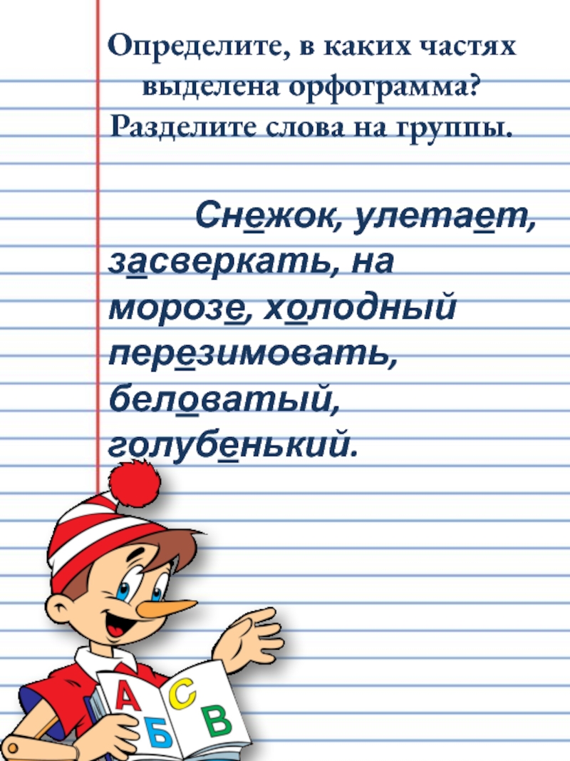 Слайд 3Определите, в каких частях выделена орфограмма? Разделите слова на группы.