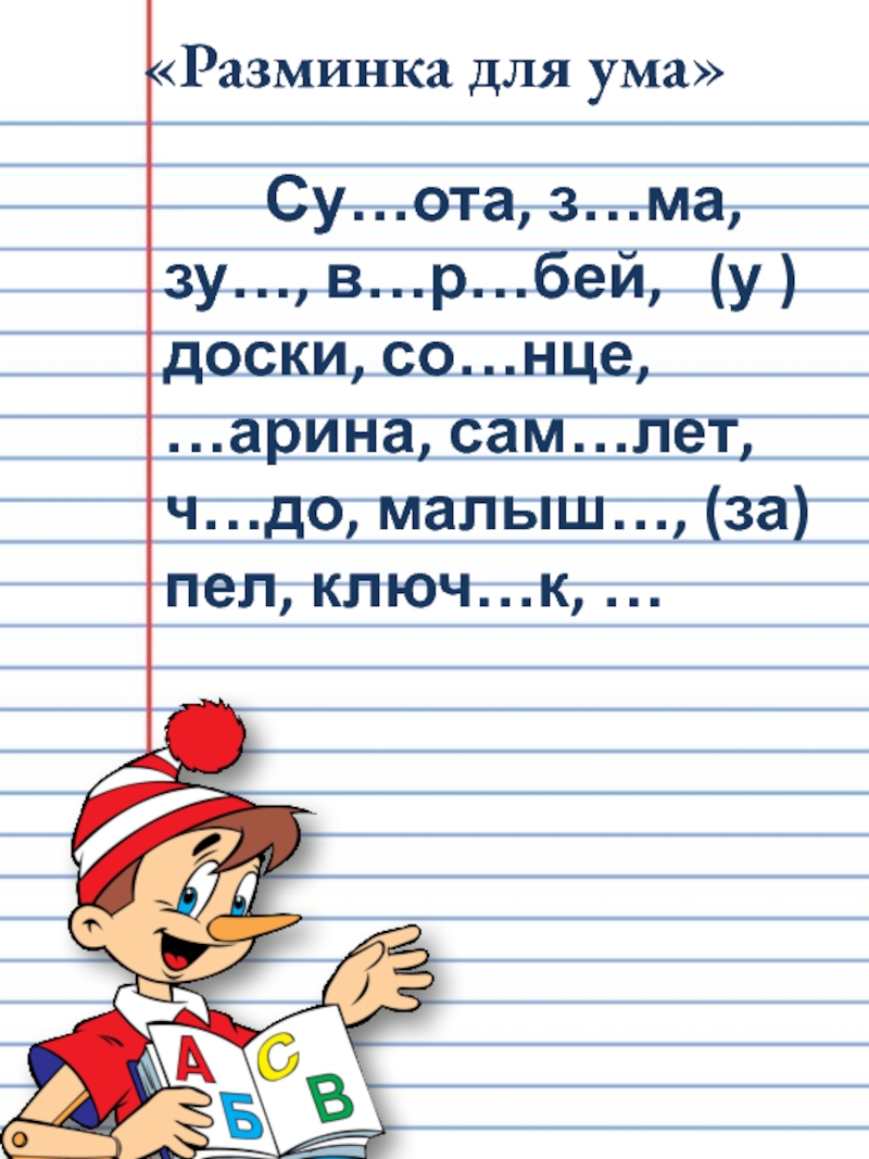 «Разминка для ума» Су…ота, з…ма, зу…, в…р…бей, (у ) доски, со…нце, …арина, сам…лет, ч…до, малыш…, (за)пел, ключ…к, …