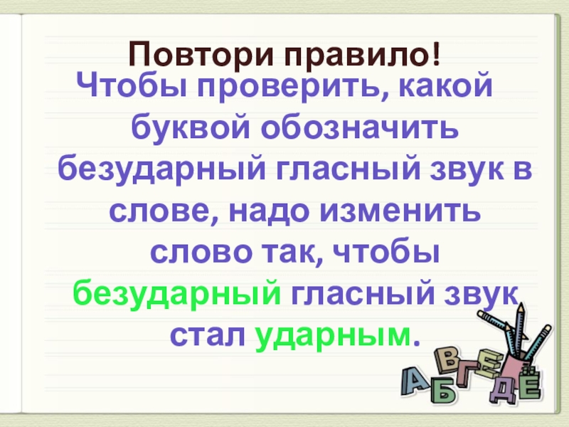 надо изменить слово так, чтобы безударный гласный звук стал ударным.