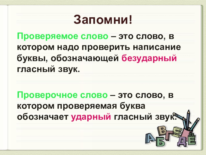 – это слово, в котором проверяемая буква обозначает ударный гласный звук.