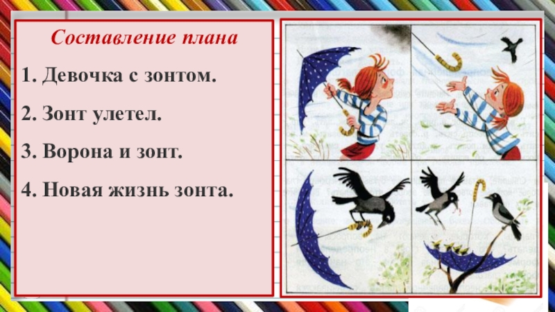 Составление плана1. Девочка с зонтом.2. Зонт улетел.3. Ворона и зонт.4. Новая жизнь зонта.