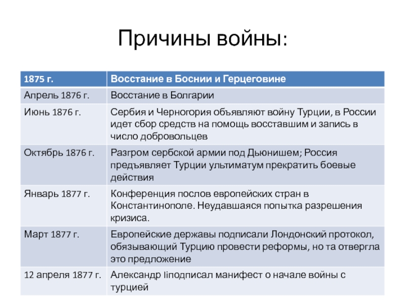 против Турции.3. Отказ Турции удовлетворить ультиматум России о прекращении боевых действий в Сербии.