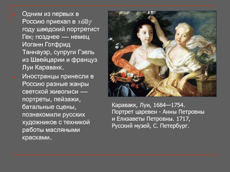 Портрет царевен - Анны Петровны и Елизаветы Петровны. 1717, Русский музей, С. Петербург.