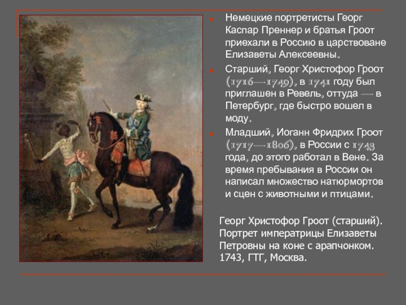 Портрет императрицы Елизаветы Петровны на коне с арапчонком. 1743, ГТГ, Москва.