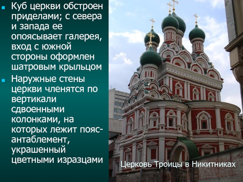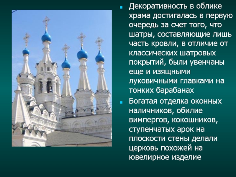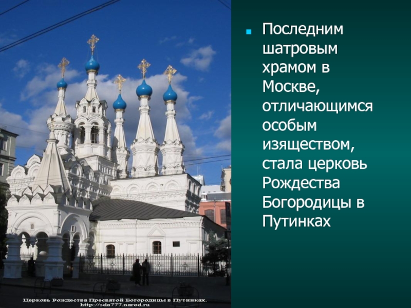 Слайд 9Последним шатровым храмом в Москве, отличающимся особым изяществом, стала церковь