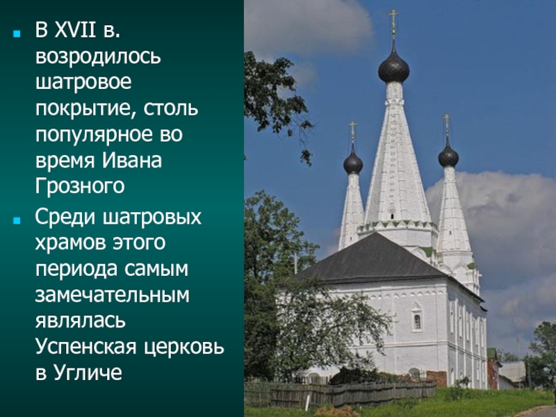 Слайд 8В XVII в. возродилось шатровое покрытие, столь популярное во время