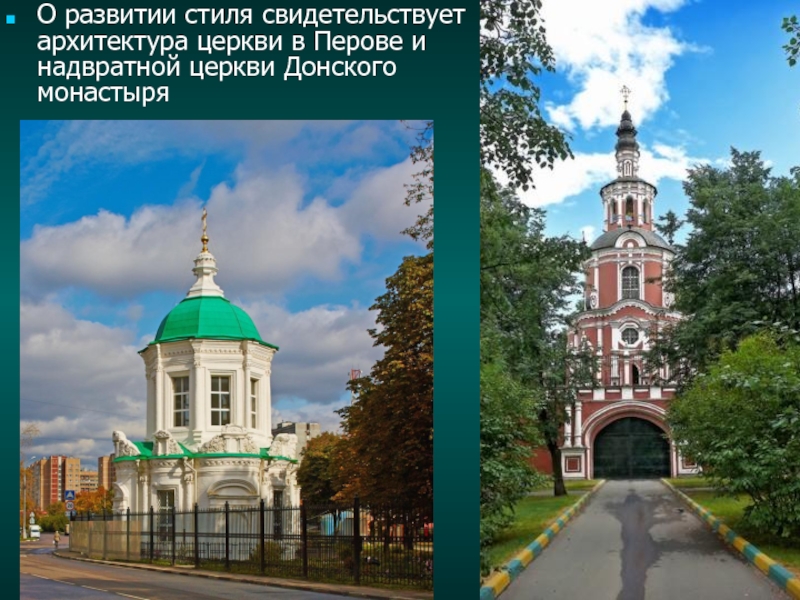 Слайд 34О развитии стиля свидетельствует архитектура церкви в Перове и надвратной