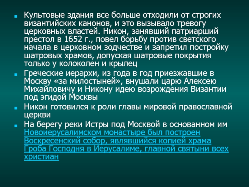 1652 г., повел борьбу против светского начала в церковном зодчестве и запретил постройку шатровых храмов, допуская шатровые покрытия только у колоколен и крылец