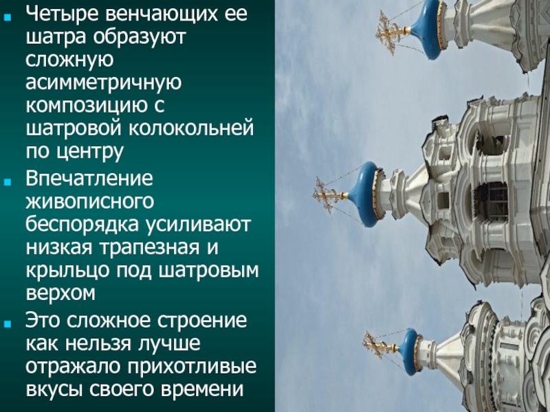 Слайд 10Четыре венчающих ее шатра образуют сложную асимметричную композицию с шатровой