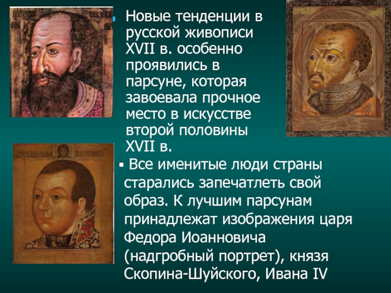 Все именитые люди страны старались запечатлеть свой образ. К лучшим парсунам принадлежат изображения царя Федора Иоанновича (надгробный портрет), князя Скопина-Шуйского, Ивана IV